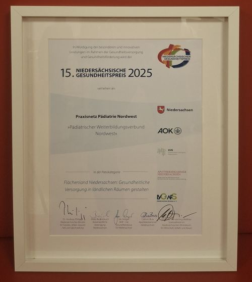 Die gemeinschaftliche Initiative aus Kinderkliniken und kinderärztlichen Praxen im Nordwesten wurde mit dem Niedersächsischen Gesundheitspreis 2025, dotiert mit 5.000 Euro, ausgezeichnet. Im Rahmen der offiziellen Preisverleihung am 05. Dezember 2025 in Hannover wurde das Engagement für die ärztliche Weiterbildung in Anwesenheit des Gesundheitsministers Dr. Philippi gewürdigt.